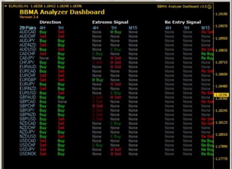BBMA Analyzer Dashboard is an advanced panel system designed to assist traders using the BBMA technique, regardless of their familiarity with it. It provides real-time BBMA signals, facilitating the analysis of preferred currencies and trend identification. This tool integrates Bollinger Bands, Moving Averages, and various money and risk management strategies, enabling traders to make well-informed decisions in the forex market.
