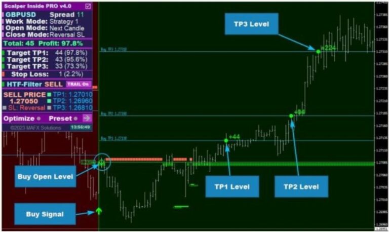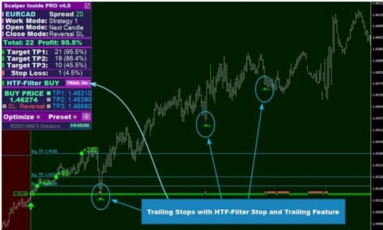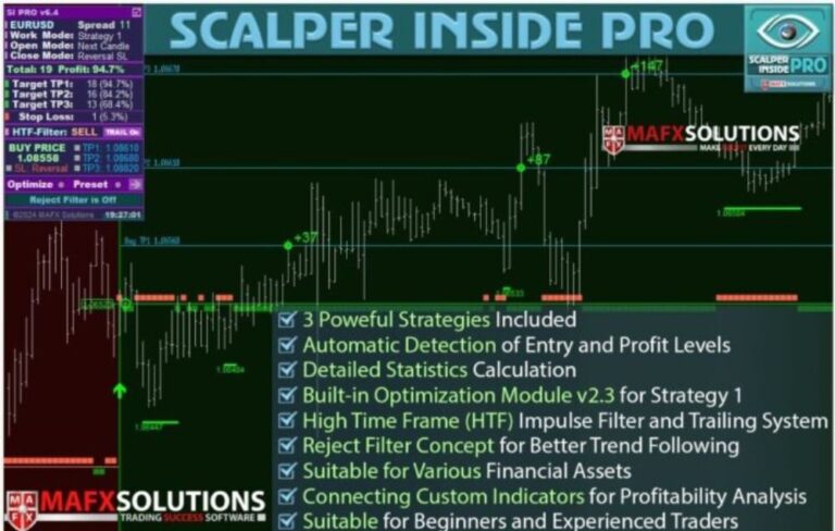 • Advanced Algorithm and Automated Calculations: Scalper Inside PRO employs the Next-Generation Trend Detection Algorithm (NG TDA) on MetaTrader 4, automating the calculations for entry, exit, and profit levels while providing comprehensive trading statistics.